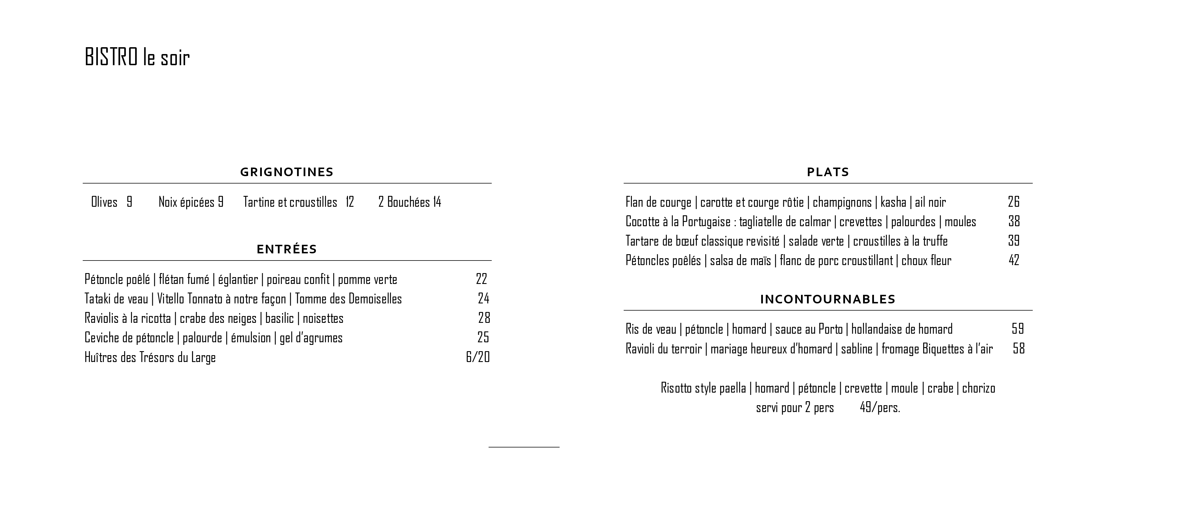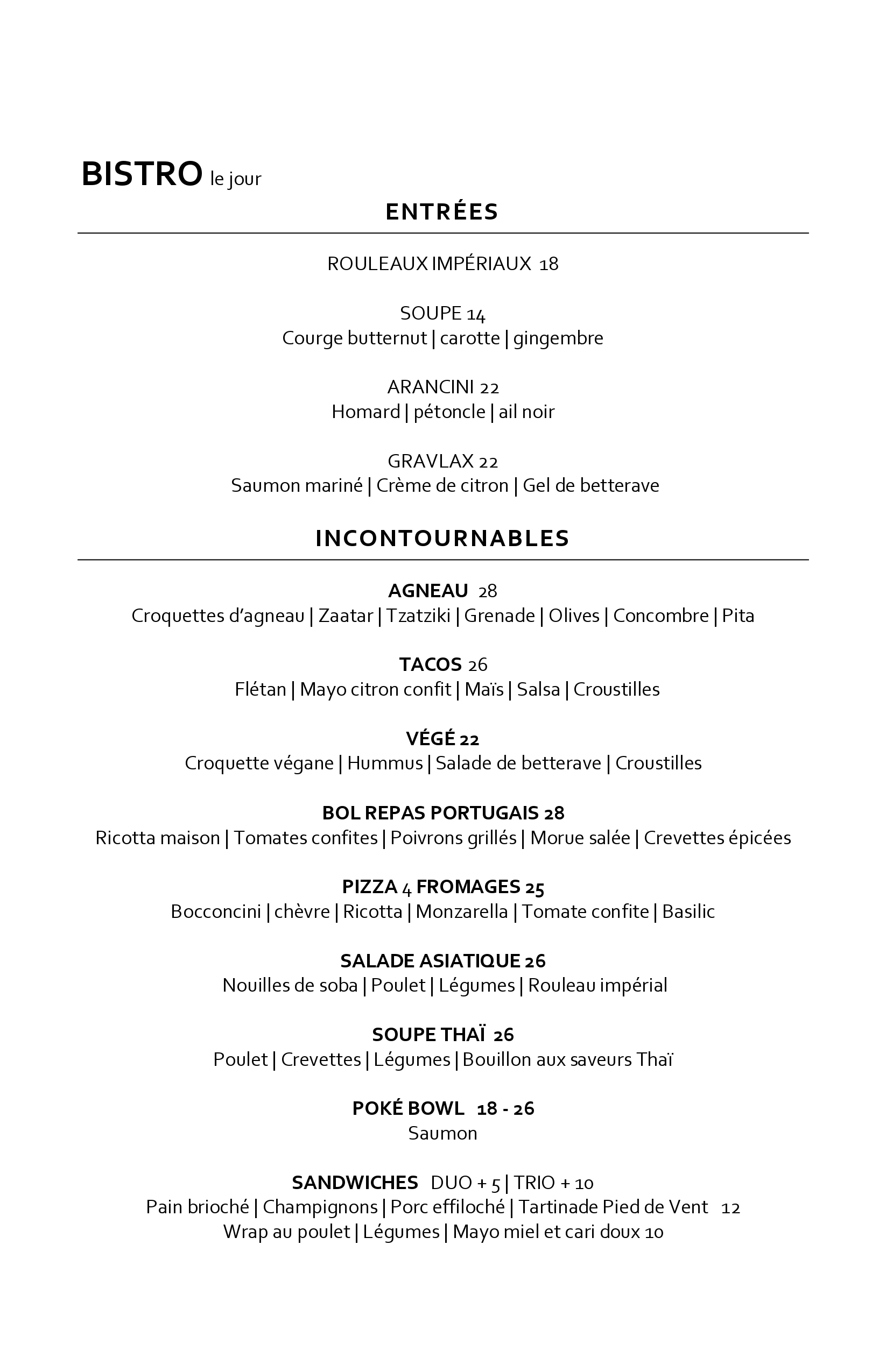 À partir de 17h30, menu BISTRO le soir servi exclusivement à l'intérieur.